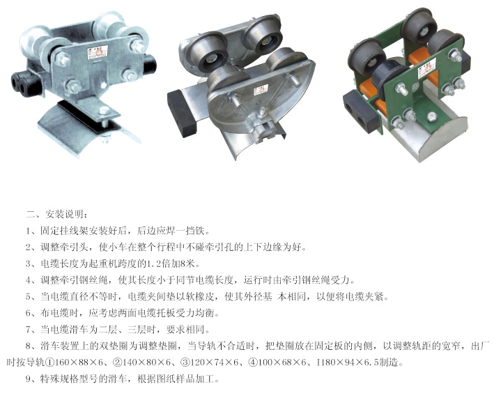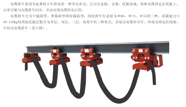 電線滑車系列為起重機(jī)小車供電的一種導(dǎo)電形式,它由行走輪、支架、托板組成,將軟電纜固定在托板上,由牽引架與電纜滑車同步。從而實(shí)現(xiàn)電纜供電目的。